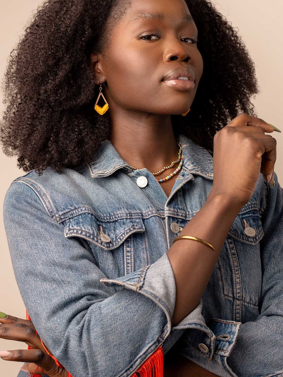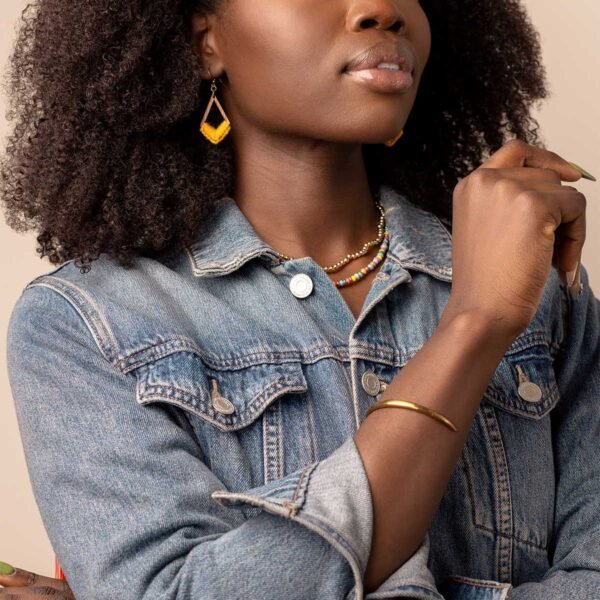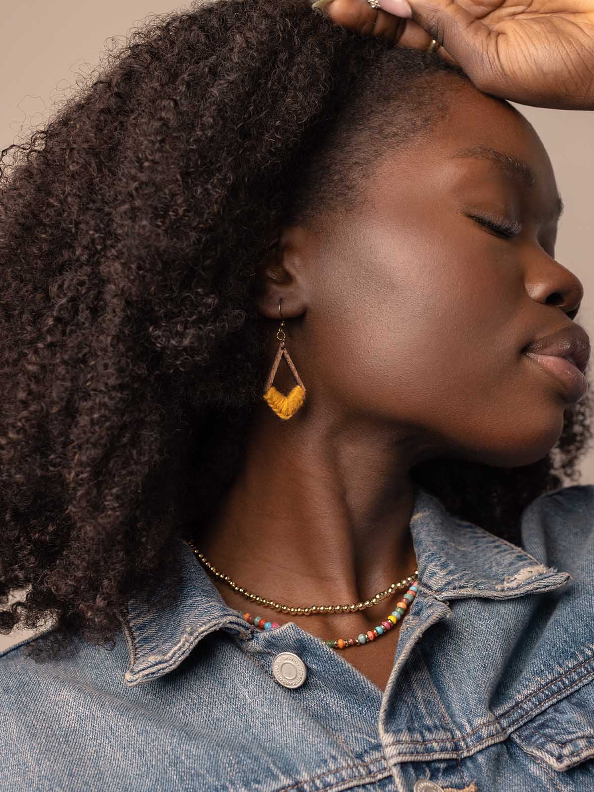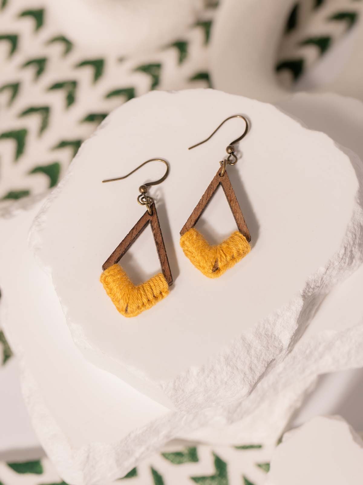 Spread a little happiness with the Boho Diamond-Shaped Yellow Earrings. Featuring a lightweight wood base. these statement earrings combine natural texture with hand-wrapped yellow thread for a warm. boho-inspired design. The exposed wood at the top of the diamond contrasts beautifully with the wrapped sides for a balanced. polished look.