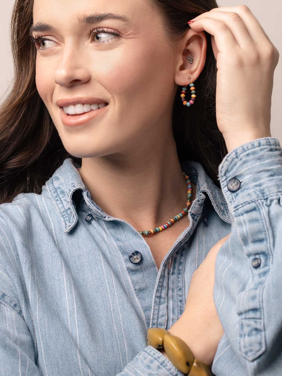 Designed to be your everyday layering essential. the Confetti Mini Bead Layering Necklace offers a lightweight. effortless look with just a hint of shine. Nearly 100 hand-rolled mini paper beads create a delicate silhouette. while tiny gold spacer beads are thoughtfully placed throughout for subtle dimension. Wear it on its own for a minimalist statement or pair it with your favorite necklaces for an easy. stacked style.
