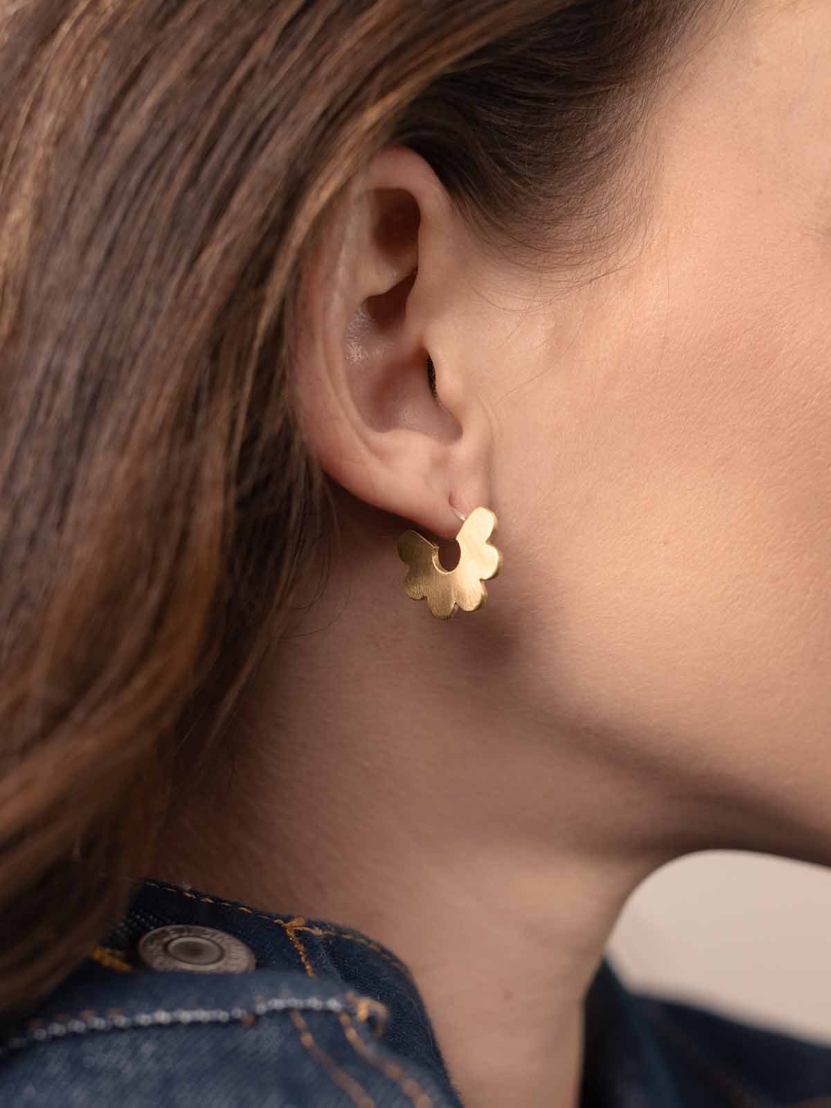 Sweet and effortlessly charming. the Gold Daisy Huggie Earrings are the perfect everyday bloom for your jewelry collection. Designed to hug the ear just right. these tiny huggie hoops feature a daisy-inspired shape with a soft satin-brushed finish. Handmade from brass with sterling silver posts. they offer a comfortable. lightweight fit that’s easy to wear from morning to night.