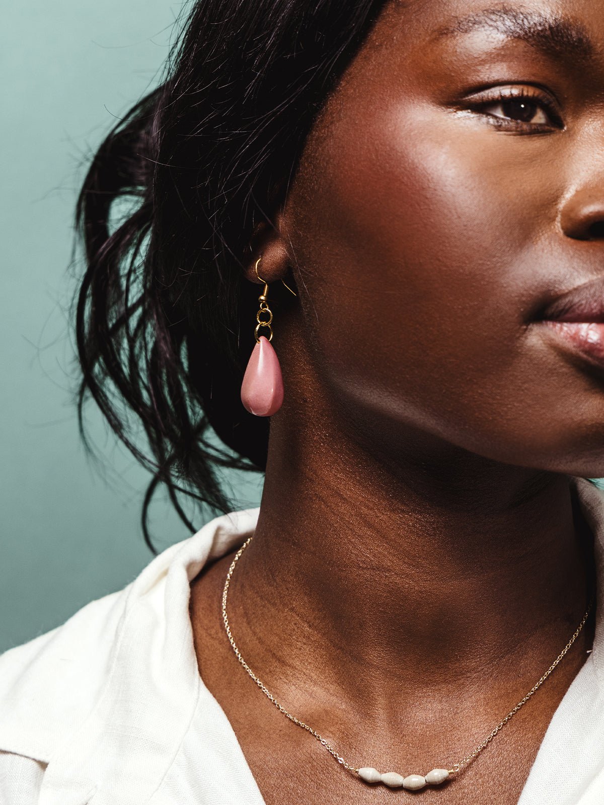 Soft and striking. our Pink Teardrop Earrings are handcrafted from sustainably sourced Tagua seed and feature a graceful. organic teardrop shape. The soft blush hue offers a gentle pop of color. making them perfect for everyday elegance. Finished with gold-plated stainless steel hooks. each pair is unique due to the natural variations in the Tagua dyeing process.