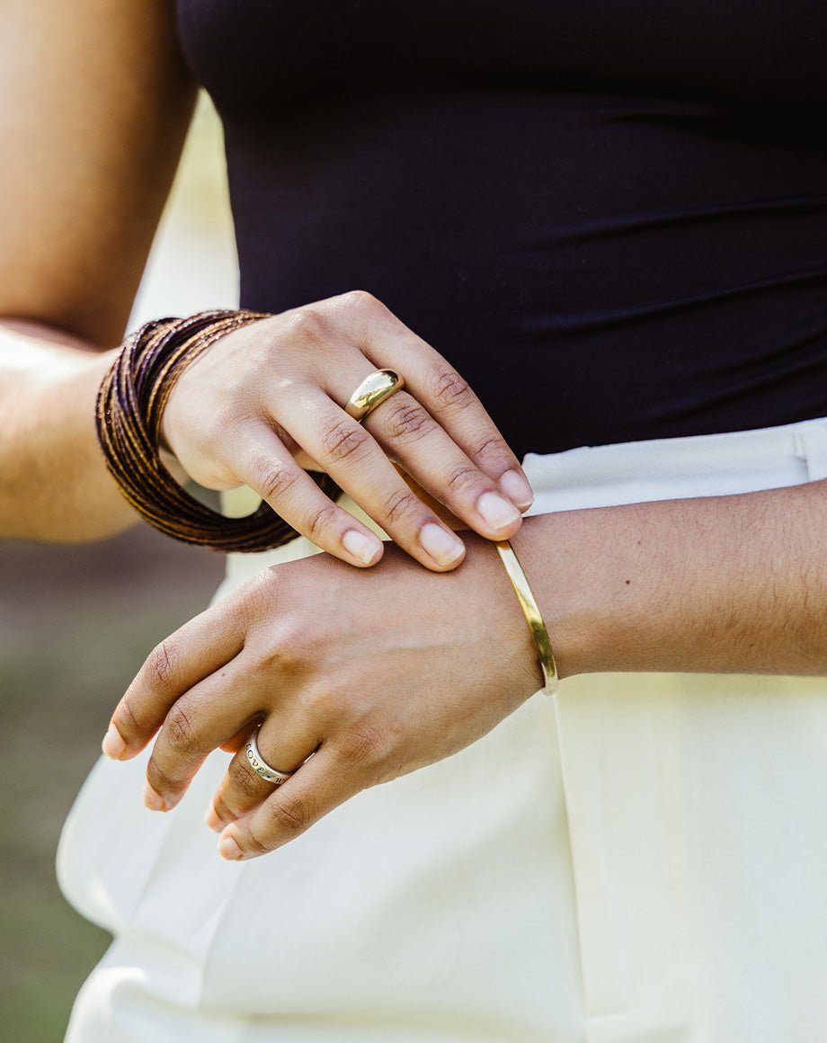 The Wema Gold Cuff Bracelet from the Nguvu Collection is a tribute to the quiet strength of kindness. Handcrafted by skilled artisans in Kenya using upcycled brass. this elegant cuff features a slim. gently tapered design with an open back for adjustable fit. The smooth. almost full-circle loop offers a timeless silhouette that’s equally striking worn solo or stacked with your favorite bangles. Wema means ??kindness?? in Swahili??a fitting name for a piece that adorns the wrist and supports dignified work and lasting impact in artisan communities.