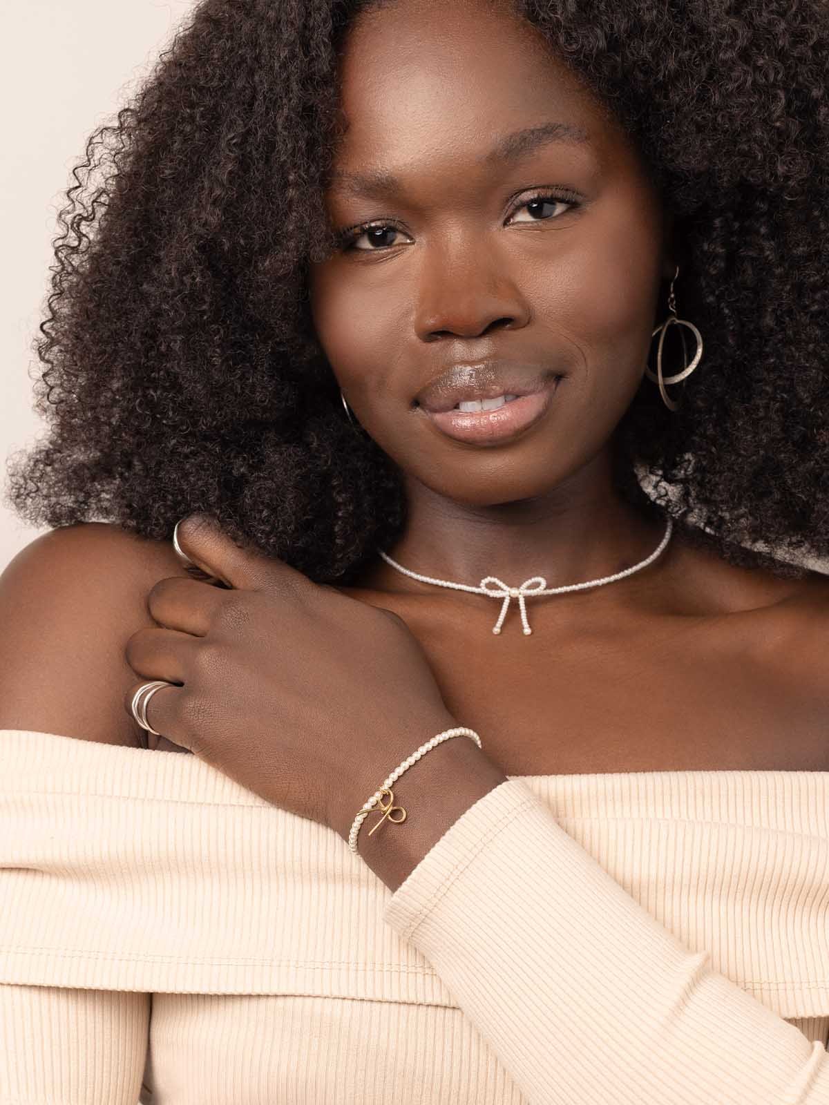 Make a striking statement with the White Beaded Bow Choker Necklace. Designed with delicate white seed beads. this elegant choker features a graceful bow detail that blends femininity with modern charm. Lightweight and refined. it sits beautifully at the neckline. adding a soft. polished finish to both casual and dressed-up looks.
